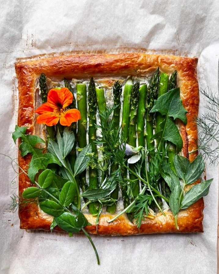 A flaky, golden tart with a creamy herbed goat cheese spread and fresh spring vegetables. Easy to customize with whatever's in your garden or fridge.